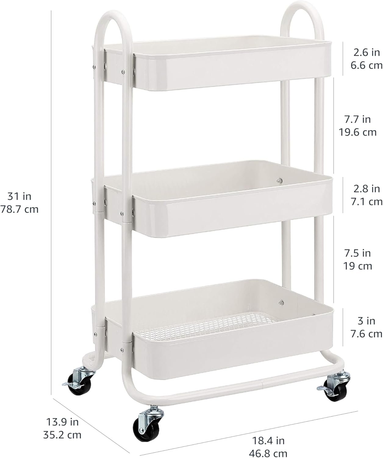 The Amazon Basics 3-Tier Rolling Utility Cart offers versatile storage for any space, featuring three sturdy mesh bins and smooth-rolling, lockable wheels for easy mobility. Perfect for organizing tools, kitchen goods, or toiletries, its anti-rust finish makes it durable for both indoor and outdoor use. With a sleek design and convenient push handle, this portable shelving unit from Amazon Basics is a must-have for maximizing organization in your home or office.