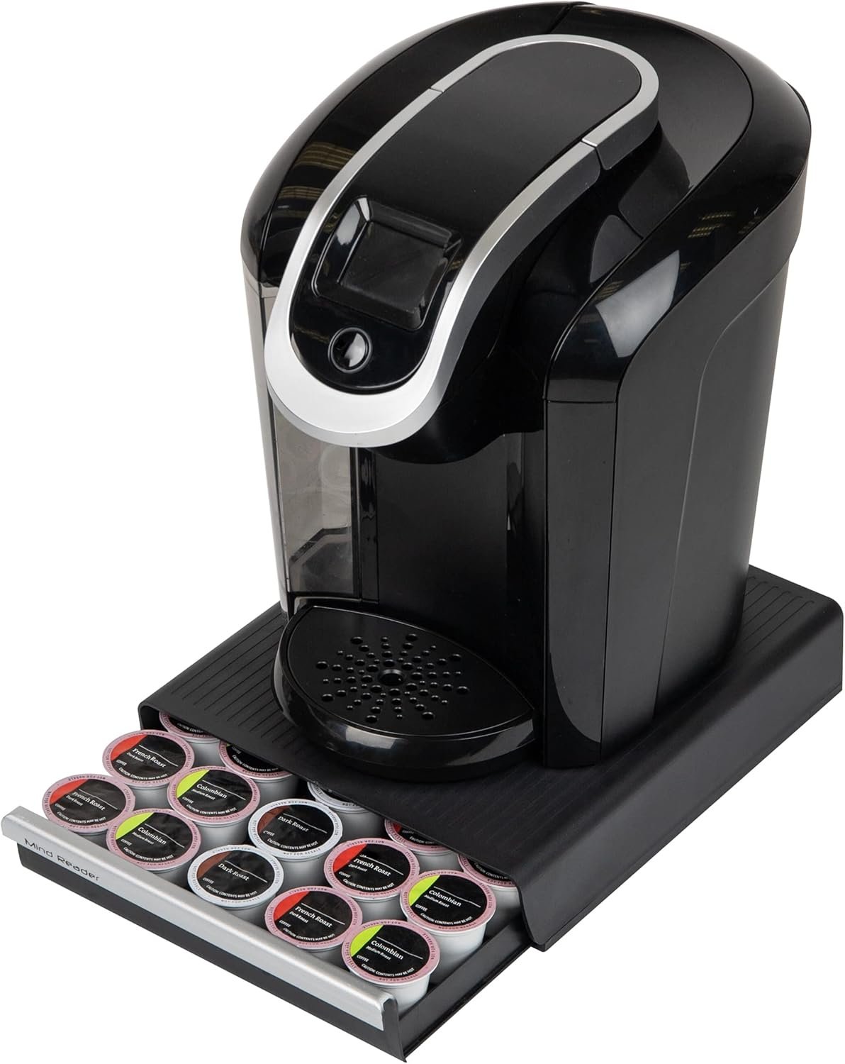 Organize your coffee routine with the Mind Reader Single Serve Coffee Pod Drawer, a sleek countertop organizer that stores up to 30 single-serve pods in five easy-access rows. Its sturdy plastic construction and rubber feet ensure stability and protection for your surfaces, while the smooth-glide drawer makes selecting your favorite brew effortless. Measuring just 10.5" x 12.75" x 2.5", this space-saving accessory is designed to fit neatly under most coffee machines—just remember to check your vertical clearance. Upgrade your coffee corner with this practical and stylish storage solution from Mind Reader.