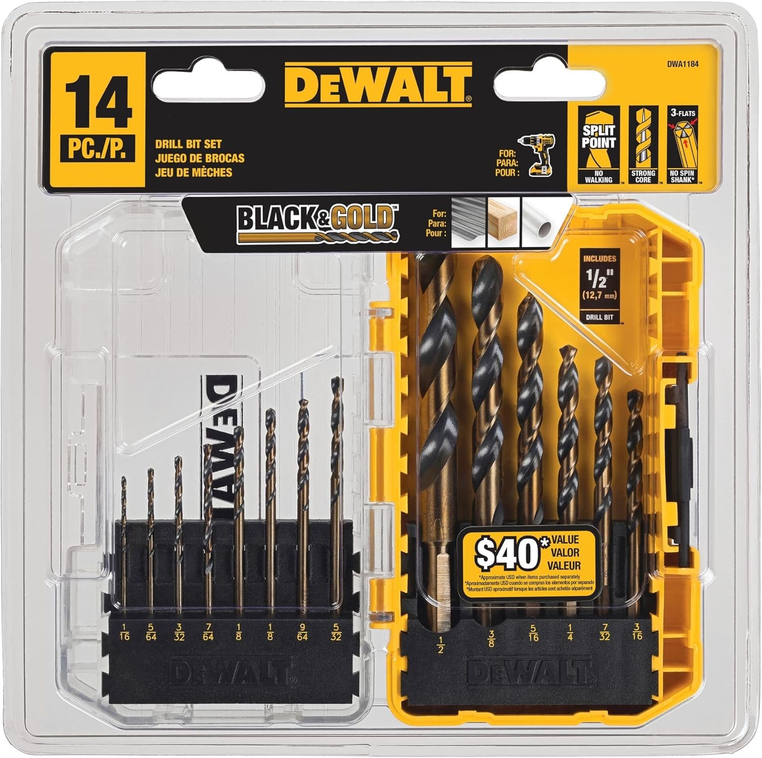 The DEWALT Drill Bit Set (DWA1184) is a versatile 14-piece kit designed for precision and durability, featuring a 135-degree split point tip to minimize walking and ensure accurate drilling. Crafted from high-speed steel, these bits deliver outstanding performance in plastic, wood, and metal, while the tapered web design resists breakage for long-lasting use. The black and gold coating prevents rust and wear, and the 3-flats shank on larger sizes reduces spin-out in the chuck. With clear size markings and trusted DEWALT quality, this set is a must-have for any toolbox.